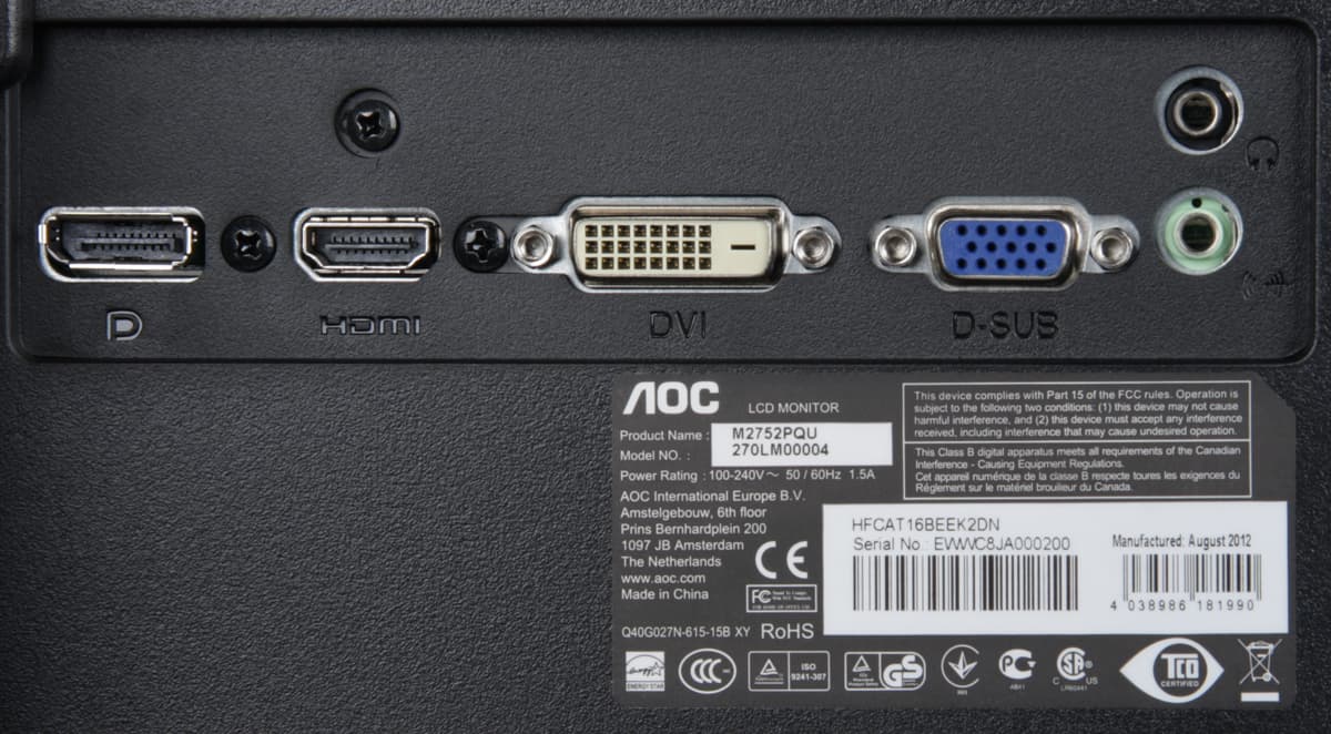 Монитор оснащен четырьмя входами: DisplayPort, HDMI, DVI-D и VGA. Есть режим с автоматическим поиском активного входа. Ручной выбор входа осуществляется кнопкой на рамке или в меню. Вход DVI-D поддерживает HDCP, поэтому, воспользовавшись кабелем-переходником (или переходником и HDMI-кабелем), к этому входу можно подключать бытовой плеер с HDMI-выходом. Вход HDMI способен принимать цифровые аудиосигналы (только PCM стерео), которые выводятся после преобразования в аналоговый вид на встроенные громкоговорители и через гнездо миниджек 3,5 мм. К этому гнезду можно подключить внешнюю активную акустическую систему или наушники. При работе от других видеовходов звук в аналоговом виде можно завести через второй разъем миниджек 3,5 мм. Встроенные громкоговорители звучат согласно их размерам и акустическому окружению — негромко, без низких частот вообще и с заметными паразитными резонансами на некоторых частотах. Мощности выхода на наушники хватило, чтобы в 32-омных наушниках громкость была достаточной, и даже с небольшим запасом. Качество звука в наушниках в принципе неплохое — звук чистый, воспроизводятся все частоты, в паузах шума не слышно, однако по субъективным ощущениям звук какой-то некомфортный.
