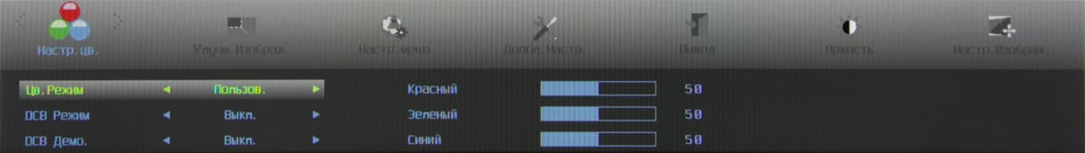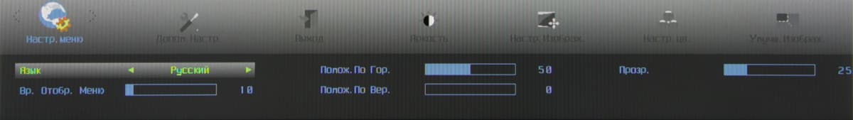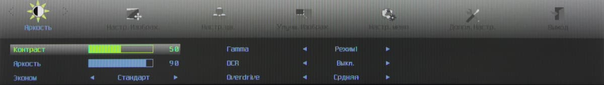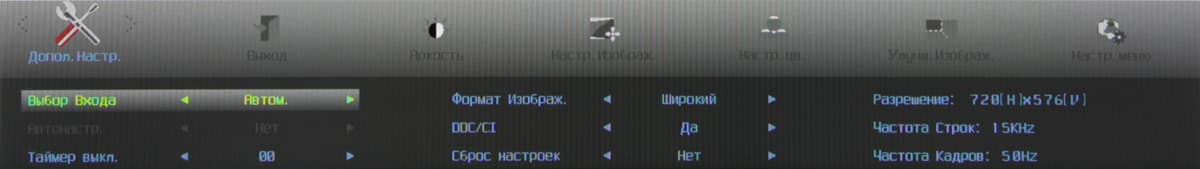 Индикатор питания при работе неярко светится синим, в режиме ожидания — красным и не горит, если монитор выключен. Когда на экране нет меню, то первая (слева направо) кнопка переключает режимы Эконом, вторая — отвечает за регулировку громкости, третья выводит список входов, а при долгом нажатии запускает автоматическую подстройку под параметры VGA-сигнала, четвертая — выводит меню установок. Меню представляет собой широкую полосу со значками страниц в верхней части и с настройками в нижней. Навигация по меню не самая удобная, но привыкнуть можно. При настройке изображения меню остается на экране, что немного мешает оценке вносимых изменений. Можно передвинуть меню, отрегулировать прозрачность его фона и установить тайм-аут автоматического выхода из меню.