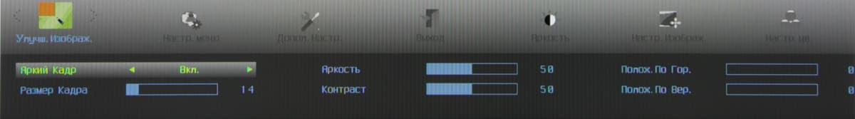 Список Гамма — это три профиля гамма-коррекции, Эконом — предустановленные сочетания установок яркости и контрастности, DCB — специальные профили цветокоррекции, а при выборе DCB Демо. экран делится на две половинки, на одной демонстрируется исходное изображение, на другой — скорректированное. Есть режим DCR, при его включении на темных изображениях яркость автоматически уменьшается, на светлых — повышается. Настройки на странице Улучш. Изображ. позволяют включить режим с прямоугольной областью, в которой выполняется независимая коррекция изображения. При этом можно изменять размер и положение этой области.