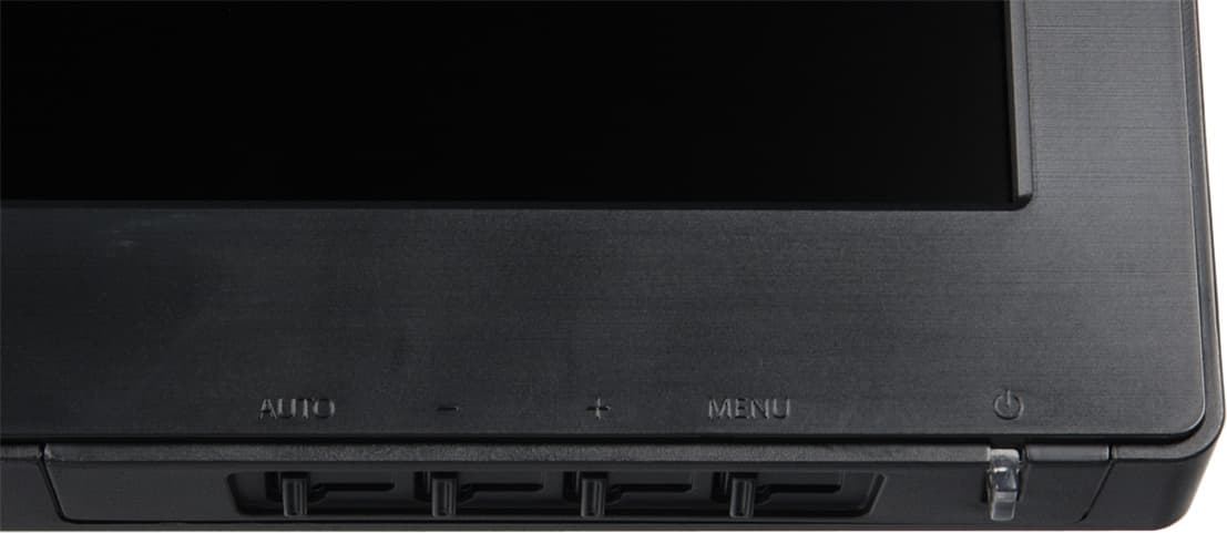 Внешние панели монитора, включая рамку вокруг экрана и подставку, изготовлены из черного пластика с матовой поверхностью. Фактура задней панели напоминает грубую ткань, и один уголок выступа сзади изящно подогнут. На этом все дизайнерские находки в случае этого монитора заканчиваются. Дальше сплошная утилитарность. Поверхность матрицы черная и полуматовая (больше матовая, чем зеркальная). На нижнем торце ближе к правому углу находятся пять кнопок управления.