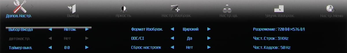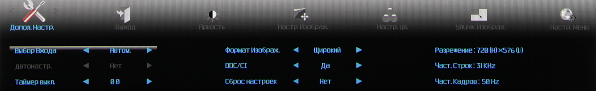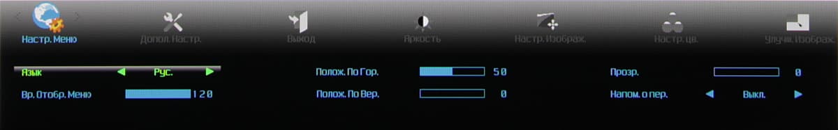 Индикатор питания при работе неярко светится зеленым, в режиме ожидания — оранжевым и не горит, если монитор условно выключен. Когда на экране нет меню, то первая (слева направо) кнопка выводит список входов, а при долгом нажатии запускает автоматическую подстройку под параметры VGA-сигнала, вторая — переключает режимы Clear Vision, третья — отвечает за регулировку громкости, четвертая — выводит меню установок. Меню представляет собой широкую полосу со значками страниц в верхней части и с настройками в нижней. Навигация по меню не самая удобная, но привыкнуть можно. При настройке изображения меню остается на экране, что немного мешает оценке вносимых изменений. Можно передвинуть меню, отрегулировать прозрачность фона и установить тайм-аут автоматического выхода из меню. Есть русская версия экранного меню.
