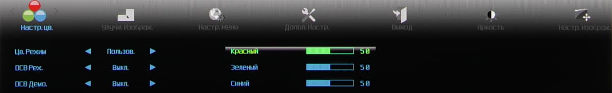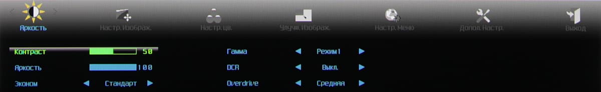 Список Гамма — это три профиля гамма-коррекции, Эконом — предустановленные сочетания установок яркости и контрастности, DCB — специальные профили цветокоррекции, а при выборе DCB Демо. экран делится на две половинки, на одной демонстрируется исходное изображение, на другой — скорректированное. Есть режим DCR, при его включении на темных изображениях яркость автоматически уменьшается, на светлых — повышается. Настройки на странице Улучш. Изображ. позволяют включить режим с прямоугольной областью, в которой выполняется независимая коррекция изображения.