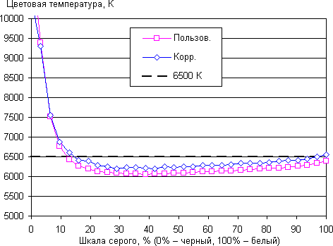 Цветопередача даже при выборе лучшего из предустановленных вариантов несколько отличается от стандартной, поэтому мы попытались вручную скорректировать цвета, регулируя усиление трех основных цветов. Графики ниже показывают цветовую температуру на различных участках шкалы серого и отклонение от спектра абсолютно черного тела (параметр ΔE) в случае пользовательского профиля в изначальном варианте и после ручной коррекции: