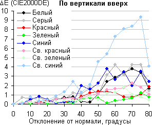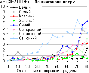 Для количественной характеристики изменения цветопередачи мы провели колориметрические измерения для белого, серого (127, 127, 127), красного, зеленого и синего, а также светло-красного, светло-зеленого и светло-синего полей во весь экран с использованием установки, подобной той, что применялась в предыдущем тесте. Измерения проводились в диапазоне углов от 0° (датчик направлен перпендикулярно к экрану) до 80° с шагом в 5°. Полученные значения интенсивностей были пересчитаны в ΔE относительно замера каждого поля при перпендикулярном положении датчика относительно экрана. Результаты представлены ниже: