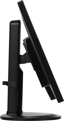 Монитор оснащен встроенным блоком питания, возможно, поэтому не обошлось без вентиляционных решеток — на верхнем и нижнем торцах выступа на задней панели. Штатная подставка позволяет блок экрана немного наклонить вперед, отклонить назад, приподнять, перевернуть в портретную ориентацию (для этого экран нужно сначала приподнять и отклонить назад) и повернуть вправо-влево.