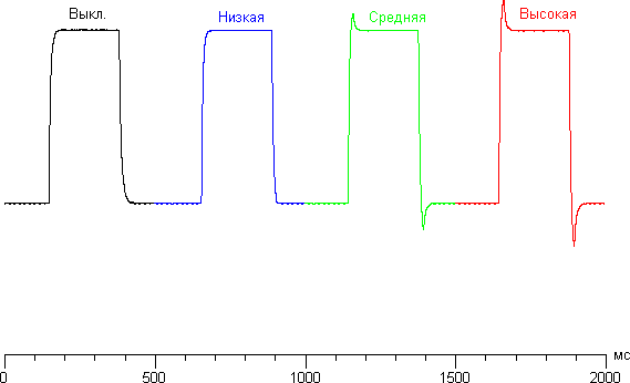 Время отклика зависит от значения настройки Overdrive, которая управляет разгоном матрицы. Ступени регулировки четыре. График ниже показывает, как меняется время включения и выключения при переходе черный-белый-черный (столбики вкл. и выкл.), а также среднее суммарное время для переходов между полутонами (столбики GTG):