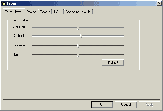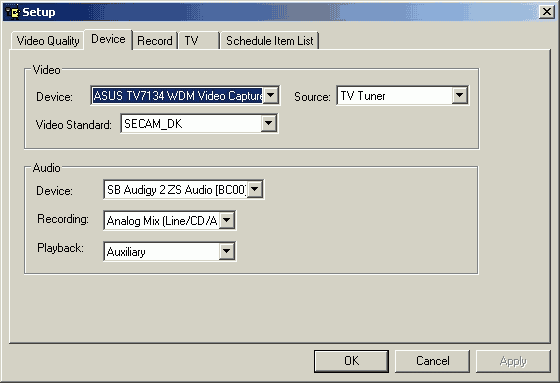 Вкладка Device позволяет выбрать используемое звуковое устройство, видеовход и стандарт цветности.