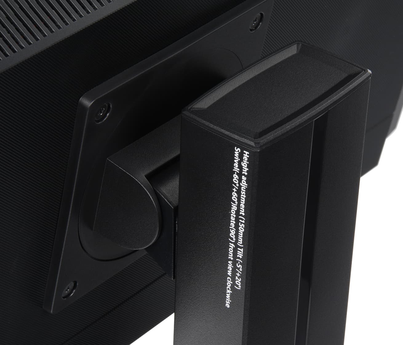 Конструкция подставки достаточно жесткая. Снизу ее основание усилено профильной пластиной из толстой стали. Собственно все несущие элементы также металлические. Вокруг вертикальной оси монитор вращается вместе с подставкой на закрепленном снизу на основании подставки диске из пластика, по периметру которого наклеены резиновые накладки — предотвращают скольжение монитора на гладких поверхностях. Снизу на само основание наклеены накладки из волокнистого материала, что облегчает поворот монитора и предохраняет поверхность стола от царапин. Такое устройство поворотной части фактически уменьшает число шарнирных сочленений и увеличивает общую жесткость конструкции. Кабели, идущие от разъемов монитора, можно прижать к стойке специальной пластиковой скобой, входящей в комплект поставки. При необходимости подставку можно отсоединить и закрепить блок экрана на VESA-совместимом кронштейне (площадка 100 на 100 мм).