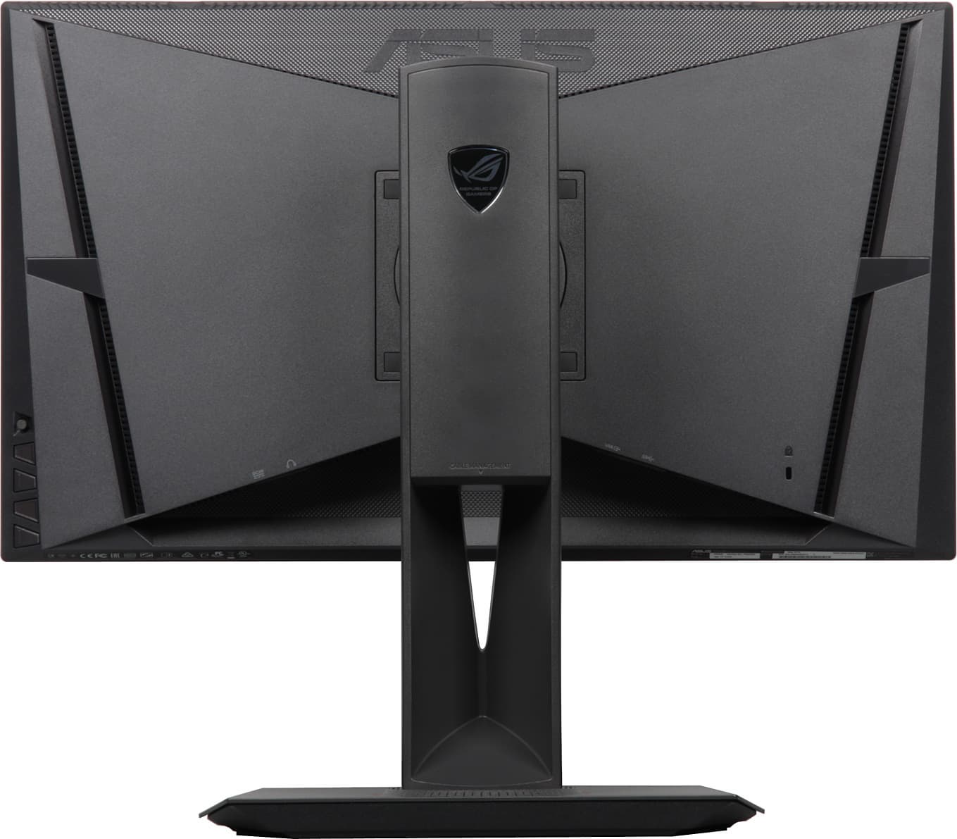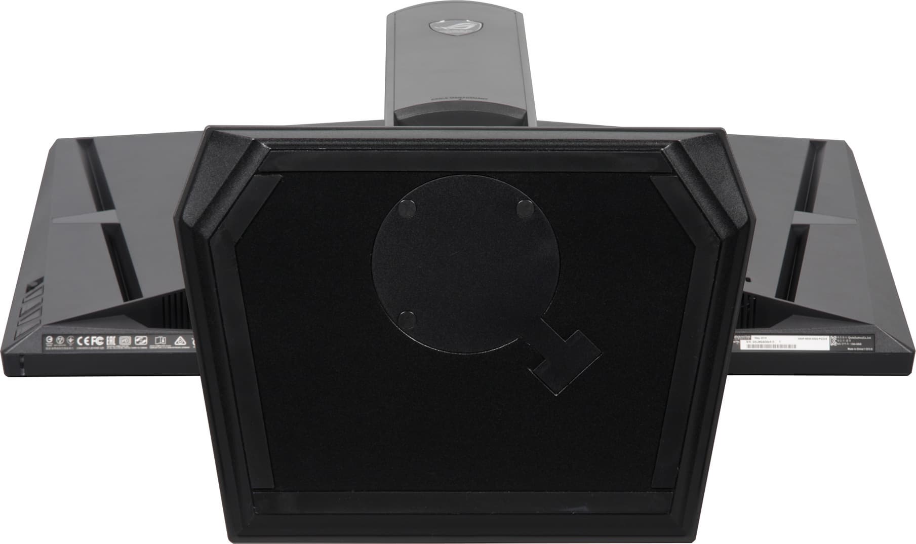 Кабели, идущие от разъемов монитора, можно пропустить сквозь вырез в нижней части стойки. При необходимости подставку можно отсоединить и закрепить блок экрана на VESA-совместимом кронштейне (площадка 100 на 100 мм). Упомянем еще два элемента, имеющие скорее декоративный характер — это логотипы на стойке сзади и на основании сверху, подтверждающие принадлежность к клубу «Republic of Gamers». Кроме того, красным подсвечивается кольцо вокруг стойки на основании подставки. Продается монитор в большой красочно оформленной коробке с пластиковой ручкой сверху, что удобно при транспортировке одним человеком. Нам она досталась в очень потрепанном виде, поэтому не покажем.