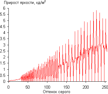 Для оценки характера роста яркости на шкале серого мы измерили яркость 256 оттенков серого (от 0, 0, 0 до 255, 255, 255) при выборе профиля Гонки, в котором, с нашей точки зрения, изображение имеет оптимальное для этого монитора качество (параметр Гамма равен 2.2). График ниже показывает прирост (не абсолютное значение!) яркости между соседними полутонами: