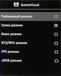 А при нажатии на кнопку с крестиком выводится только короткое меню из значков-подсказок напротив кнопок. Подсказки нам говорят: джойстик — вход в меню и манипуляции с ним, кнопка ниже — выход из пункта/меню/отмена режима, ниже — кнопка вызова функций GamePlus, и еще ниже — кнопка GameVisual — выбор режимов изображения. Для самой нижней кнопки значок на экране уже не поместился, но по значку на рамке видно, что это кнопка питания. Работу кнопок можно заблокировать в меню. Чтобы отменить блокировку кнопок, нужно нажать кнопку с крестиком и удерживать ее нажатой не менее 5 секунд. Основное меню большое. Текст в меню относительно мелкий, но его абсолютные размеры обеспечивают приемлемую читаемость. При настройке изображения меню остается на экране, что немного мешает оценке вносимых корректировок. Настраивается прозрачность фона, положение меню на экране и задержка автоматического выхода из меню. Присутствует русская версия экранного меню.