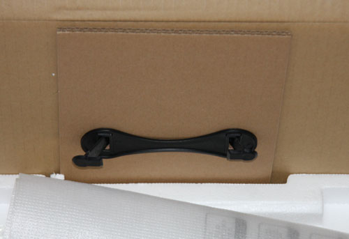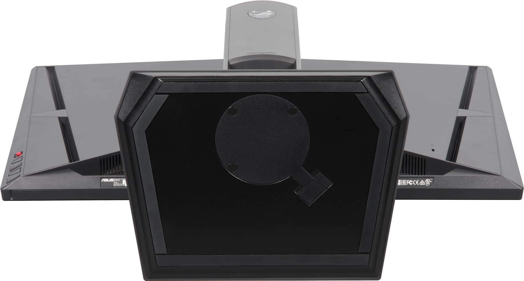Кабели, идущие от разъемов монитора, можно пропустить сквозь вырез в нижней части стойки. При необходимости подставку можно отсоединить и закрепить блок экрана на VESA-совместимом кронштейне (площадка 100 на 100 мм). Упомянем еще два элемента, имеющие скорее декоративный характер — это логотипы на стойке сзади и на основании сверху, подтверждающие принадлежность к клубу «Republic of Gamers», при этом второй логотип подсвечивается красным. Кроме того, также красным подсвечивается и кольцо вокруг стойки на основании подставки. Продается монитор в большой красочно оформленной коробке с пластиковой ручкой сверху, что удобно при транспортировке одним человеком. Нам она досталась в потрепанном виде, но не показать ее мы не можем.