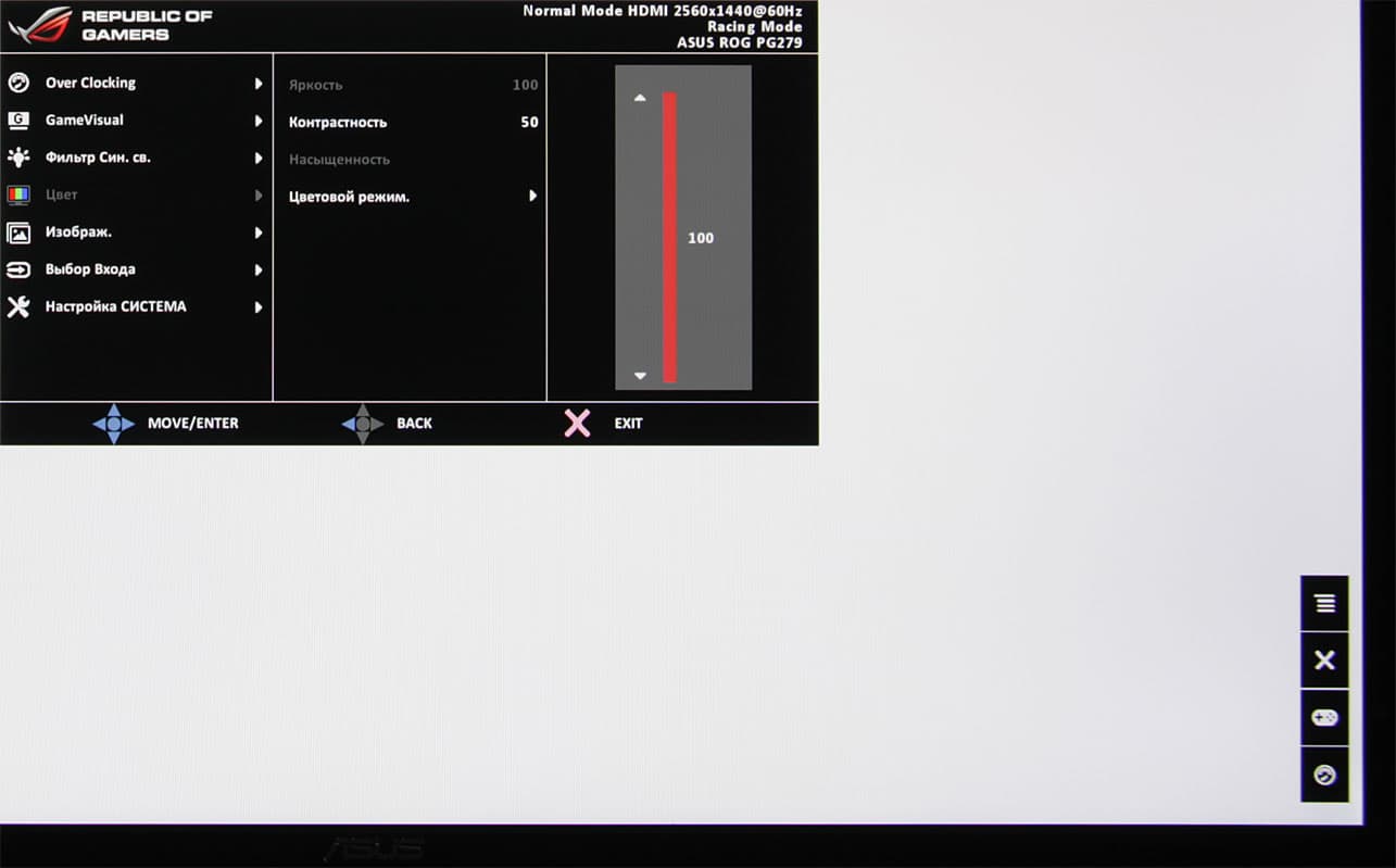 Индикатор состояния неяркий. Он светится белым при работе монитора, оранжевым в режиме ожидания и не горит, когда монитор условно выключен. При работе монитора в режиме Nvidia G-Sync индикатор красный, а при включенной функции ULMB — желтый. Кольцо и логотип на основании менее функциональны — они просто светятся красным при работе монитора и медленно мигают в режиме ожидания. Эту подсветку можно отключить, добравшись до пункта меню со странным названием Свет в движении. Навигация по меню относительно удобная, и еще больше удобство повышается за счет джойстика. Если монитор работает, и на экране нет меню, то при первом нажатии (отклонение игнорируется) на джойстик выводится основное меню.
