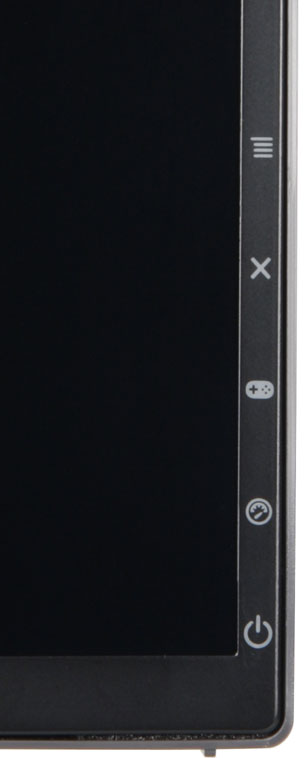 Фронтальная рамка узкая, плоская, стальная, с матовым черным покрытием. Справа внизу на вертикальной части фронтальной рамки нанесены значки кнопок, а сами кнопки расположены на задней панели напротив меток. Верхняя кнопка представляет собой 5-позиционный джойстик, а другие кнопки то вогнуты, то выпуклые с ребром.