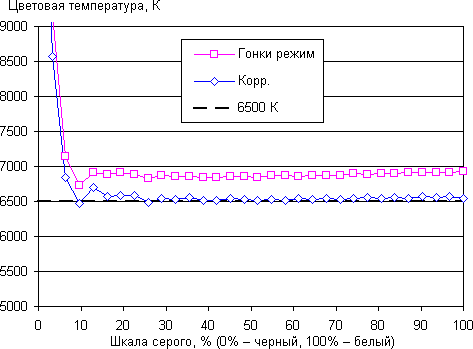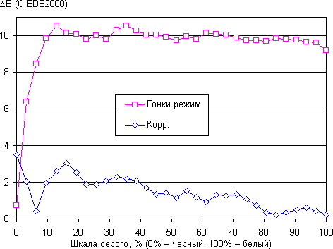 Цветопередача даже при выборе лучшего из предустановленных вариантов (а это оказался Гонки режим в исходном виде) несколько отличается от стандартной, поэтому мы попытались вручную скорректировать цвета, регулируя усиление трех основных цветов. Графики ниже показывают цветовую температуру на различных участках шкалы серого и отклонение от спектра абсолютно черного тела (параметр ΔE) в случае профиля Гонки режим и после ручной коррекции: