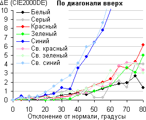 Для количественной характеристики изменения цветопередачи мы провели колориметрические измерения для белого, серого (127, 127, 127), красного, зеленого и синего, а также светло-красного, светло-зеленого и светло-синего полей во весь экран с использованием установки, подобной той, что применялась в предыдущем тесте. Измерения проводились в диапазоне углов от 0° (датчик направлен перпендикулярно к экрану) до 80° с шагом в 5°. Полученные значения интенсивностей были пересчитаны в ΔE относительно замера каждого поля при перпендикулярном положении датчика относительно экрана. Результаты представлены ниже: