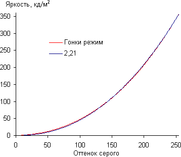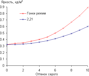 Для оценки характера роста яркости на шкале серого мы измерили яркость 256 оттенков серого (от 0, 0, 0 до 255, 255, 255) при выборе профиля Гонки, в котором, с нашей точки зрения, изображение имеет оптимальное для этого монитора качество. График ниже показывает прирост (не абсолютное значение!) яркости между соседними полутонами: