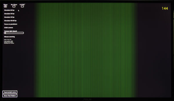 Далее, мы протестировали реализацию в данном мониторе технологии G-Sync. Заметим, что нажатие на кнопку Turbo в обычном 2D-режиме просто выводит на экран окошко с текущей частотой обновления, в режиме трехмерной графики позволяет менять частоту обновления (перебор доступных), а в режиме G-Sync происходит перебор максимальной частоты обновления. Сразу оговоримся, что именно игровых тестов мы не проводили из-за недостаточного опыта в этой сфере и из-за слишком большого влияния субъективного фактора На первом этапе мы воспользовались демонстрационной программой Nvidia G-Sync Pendulum Demo. Программа демонстрирует качающийся маятник, который за один отрисованный кадр перемещается на фиксированный угол, но с переменным ускорением (имитация настоящего маятника), в результате частота отрисовки постоянно меняется. Три переключателя слева вверху позволяют изменять режим вывода. Визуальное тестирование показало, что при включенной VSync изображение маятника неприятно дергается, при выключенной VSync движение более плавное, но картинка вся в разрывах, и только в режиме G-Sync все идеально — движение плавное, разрывов нет.