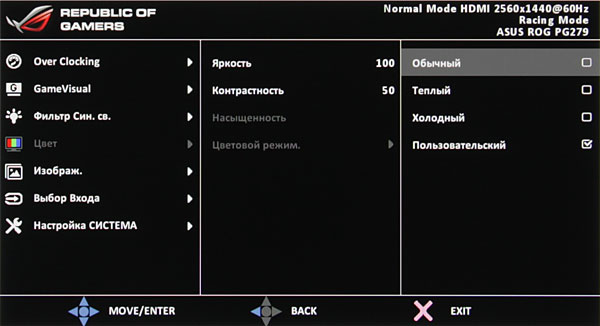 Настроек не очень много, есть регулировки яркости, контрастности и насыщенности, а также выбор цветового профиля из трех предустановленных или пользовательского, в котором цветовой баланс можно подправить регулировками интенсивности трех основных цветов.