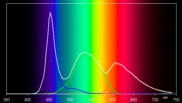 Такой спектр с относительно узким пиком синего и с широкими горбами зеленого и красного цветов характерен для мониторов, в которых используется белая светодиодная подсветка с синим излучателем и желтым люминофором.