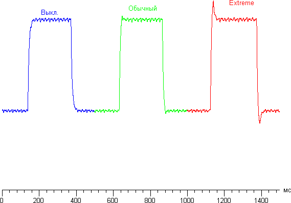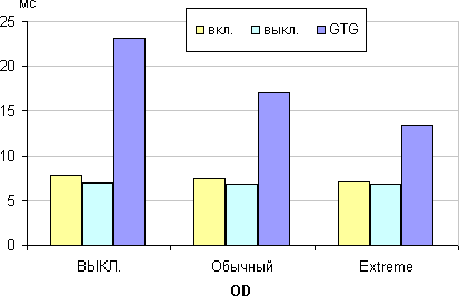 Время отклика зависит от значения настройки OD (видимо, от Over Drive), которая управляет разгоном матрицы. При Выкл. разгона нет, при Обычный разгон средний, при Extreme разгон максимальный. График ниже показывает, как меняется время включения и выключения при переходе черный-белый-черный (столбики вкл. и выкл.), а также среднее суммарное время для переходов между полутонами (столбики GTG):