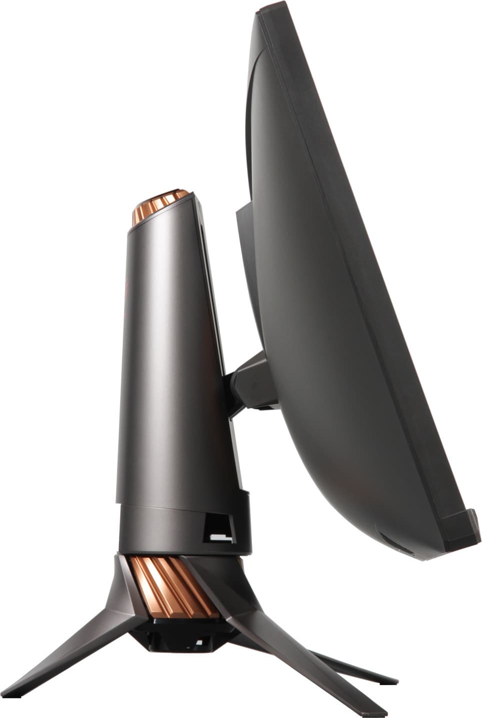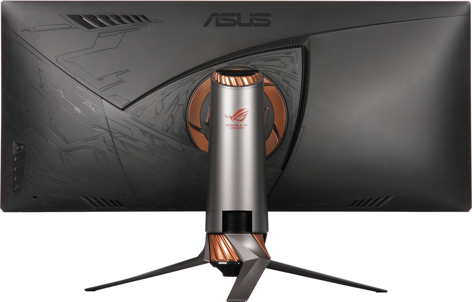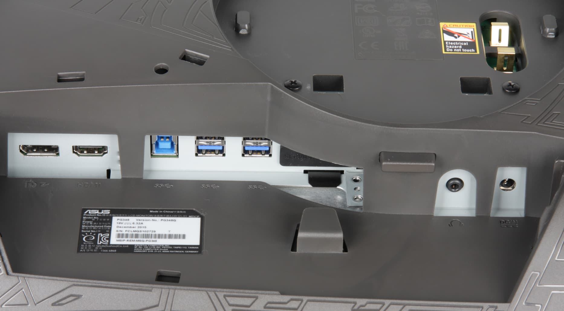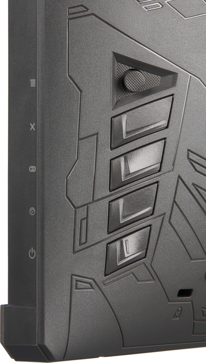 Дизайнеры компании Asus хорошо постарались. То, как выглядит этот монитор, может нравиться, может нет, но PG348Q точно выделяется на фоне своих собратьев и изогнутый экран как запоминающийся момент в данном случае отходит на второй план. Внешние панели монитора изготовлены из темно-серого (почти черного) матового пластика, в основном ровного, но местами с фактурой и геометрическим узором. Внешняя поверхность матрицы черная, полуматовая (но зеркальность проявляется в случае отражения точечных источников света), внешний слой матрицы жесткий.