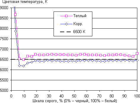 Цветопередача при выборе лучшего из предустановленных вариантов (а это оказался Гонки режим в исходном виде) мало отличается от стандартной, но все равно мы попытались вручную скорректировать цвета, регулируя усиление трех основных цветов. Графики ниже показывают цветовую температуру на различных участках шкалы серого и отклонение от спектра абсолютно черного тела (параметр ΔE) в случае профиля Гонки режим и после ручной коррекции: