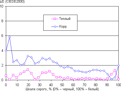 Самый близкий к черному диапазон можно не учитывать, так как в нем цветопередача не так важна, а погрешность измерения цветовых характеристик высокая. Ручная коррекция еще больше приблизила точку белого к стандартным 6500 К, но ΔE, как и ее разброс в среднем увеличились. Вмешиваться смысла не было.