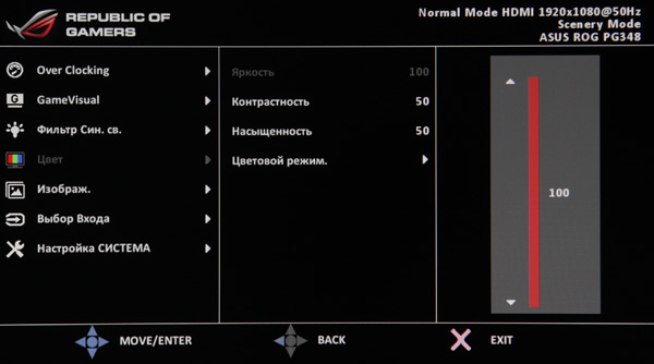 Настроек не очень много, есть регулировки яркости, контрастности и насыщенности, а также выбор цветового профиля из трех предустановленных или пользовательского, в котором цветовой баланс можно подправить регулировками интенсивности трех основных цветов.