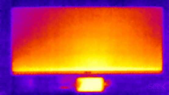 Нагрев монитора можно оценить по приведенным снимкам с ИК-камеры, полученным после долговременной работы монитора на максимальной яркости в помещении с температурой примерно 24 °С (ближе к белому — выше температура; на второй фотографии внизу лежит БП):