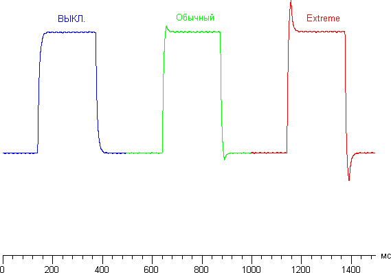 Время отклика зависит от значения настройки OD (видимо, от Over Drive), которая управляет разгоном матрицы. При Выкл. разгона нет, при Обычный разгон средний, при Extreme разгон максимальный. График ниже показывает, как меняется время включения и выключения при переходе черный-белый-черный (столбики вкл. и выкл.), а также среднее суммарное время для переходов между полутонами (столбики GTG):