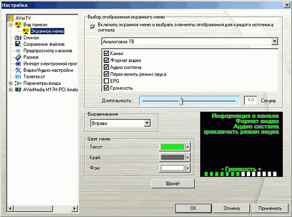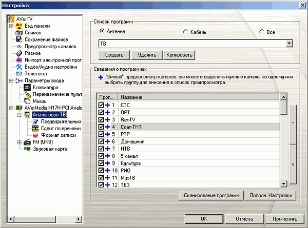 Остальные настройки, изменяемые для каждого канала индивидуально, вызываются при помощи специальной кнопки на панели интерфейса либо посредством контекстного меню. Таким образом, к стандарту цветности и режимам звука добавляются яркость, контраст, оттенок, насыщенность, резкость, масштабирование (overscan), тип деинтерлейсинга (Bob, Weave, краевое сглаживание) и названное в русском варианте Повышением качества видео шумоподавление (включено, выключено, автоматический выбор).