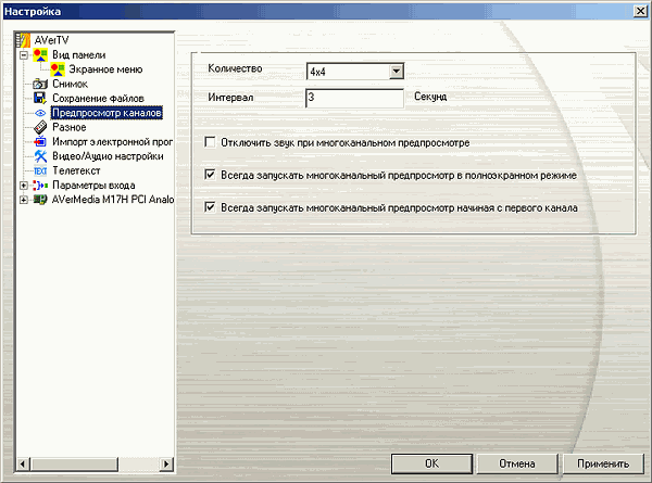 В последней версии появился раздел настроек многоканального предварительного просмотра, позволяющий выбрать размер матрицы (от 2×2 до 8×8), интервал переключения каналов, отключение звука в этом режиме, выбор между полноэкранным и оконным отображением и запуск просмотра с первого канала.