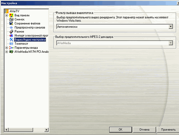 Ещё один новый раздел Видео/Аудио настройки содержит два пункта — выбор видеорендерера (автоматически, Overlay Mixer и Video Mixing Renderer) и MPEG2-декодера (только для Windows Vista).