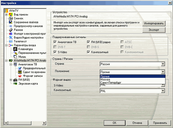 Раздел основных настроек устройства позволяет отключить любой внутренний источник, включая низкочастотные входы, и настроить стандарты для S-Video и композитного видеовхода. Здесь же осуществляется выбор региона. Для Москвы и Санкт-Петербурга предусмотрены уже готовые списки каналов эфирного вещания.