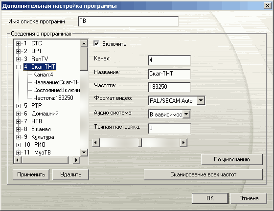 В дополнительных настройках можно найти не только название канала, частоту и индивидуальный стандарт цветности (жёсткой установки не предусмотрено, только автоматическое определение), но и поиск по частоте.