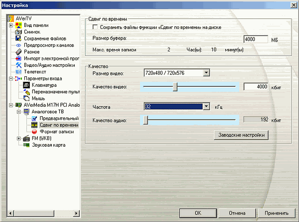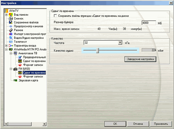 FM-режим имеет свои настройки режима отложенного просмотра, точнее прослушивания. В одноименном разделе можно выставить битрейт (192-384 кбит/с) и частоту дискретизации (32, 44.1, 48 кГц). Сохранение буферного файла доступно и здесь.