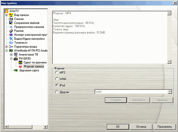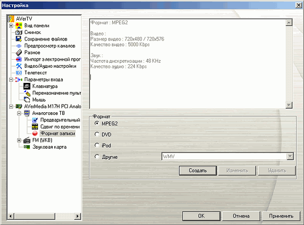 К нескольким стандартным профилям, представленным в разделе Формат записи можно добавлять пользовательские. Поддержка сторонних кодеков в настоящее время ограничена DivX и XviD.