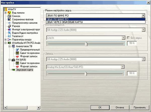 Раздел Звуковая карта позволяет выбрать способ передачи звука (по шине или кабелем), а также настроить линии микшера во втором случае для записи и воспроизведения.