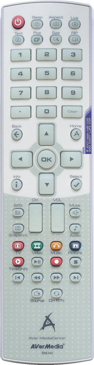 Тюнер комплектуется совершенно новым пультом ДУ, специально предназначенным для работы с AVerMedia Center. Несмотря на больший по сравнению с уже знакомыми нам пультами размер, эргономика новинки находится на очень хорошем уровне, чему способствуют крупные кнопки с информативным нажатием, в зависимости от функционального назначения отличающиеся формой и размером. Для управления многооконными режимами выделены отдельные кнопки. «Изюминкой» является флюоресцентная подсветка, встречающаяся у пультов для работы с некоторыми моделями бытовой техники, но для ПДУ из комплекта компьютерных тюнеров пока не ставшая частым явлением. Питание от двух элементов типоразмера AAA. Шарнирное крепление крышки батарейного отсека позволяет избежать её потери.