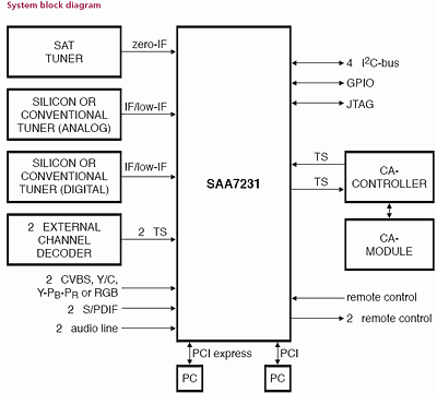 С декодером NXP SAA7231NE нам пока встречаться не доводилось. Этот чип с поддержкой как PCI-Express (используется в нашем случае), так и PCI, является одной из последних разработок NXP и представляет собой универсальное решение с высокой степенью интеграции, поддерживая кроме привычных аналогового вещания и цифрового в формате DVB-T, спутниковое в формате DVB-S, что позволяет обходиться без дополнительного COFDM (Coded Orthogonal Frequency Division Multiplexing) демодулятора. Кроме того, декодер имеет встроенный ИК-контроллер и не нуждается в дополнительных микросхемах для работы с RDS (Radio Data System), самостоятельно справляясь и с этой задачей.