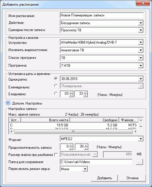 Как и в случае с режимом отложенного просмотра, видеобитрейт при использовании штатного MPEG2-кодека ограничен диапазоном 2000—8000 Кбит/с. Это не относится к частоте дискретизации (доступны 32, 44,1 и 48 кГц) и аудиобитрейту (192—384 Кбит/c). Отдельно отметим возможность использования штатного программного шумоподавления не только при просмотре, но и при записи.