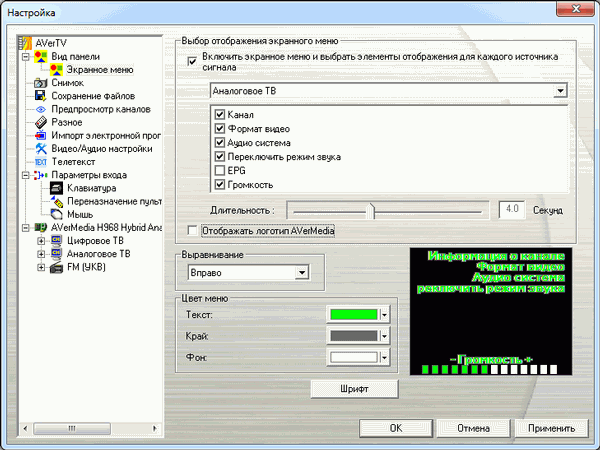 Подраздел «Экранное меню» позволяет выбрать цветовую гамму, длительность отображения меню, его расположение и параметры для вывода на экран (канал, систему цветности, режим звука, информацию о телепрограмме и громкость). В версии 6.3.1 добавлен вывод логотипа AVerMedia.