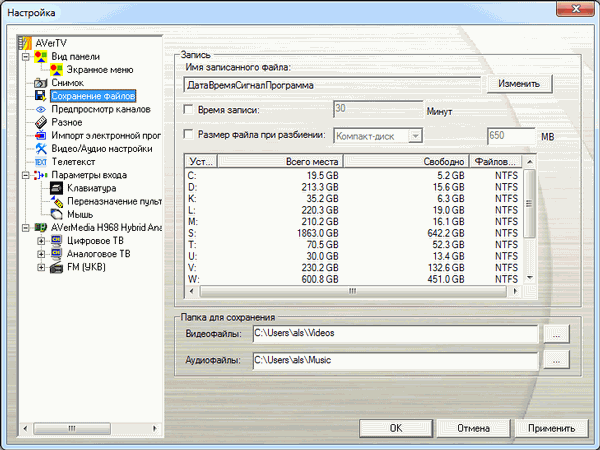 Раздел отвечающий за сохранение файлов, предоставляет доступ к папкам для сохранения видео и аудиофайлов, настройкам ограничения времени записи и разбиения файлов по размеру. Префиксы в названиях файлов совпадают с перечисленными выше для захвата кадров.