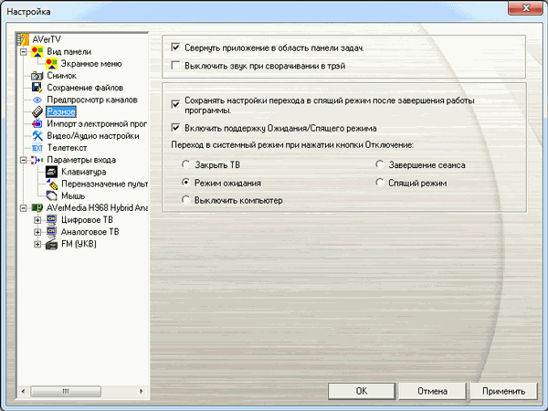Раздел «Разное» позволяет настроить сворачивание приложения в системный трей с опциональным отключением звука. Здесь же находится поддержка энергосберегающих режимов с действиями, совершаемыми после отключения (закрыть приложение, завершить сеанс, режим ожидания, спящий режим, выключить компьютер).