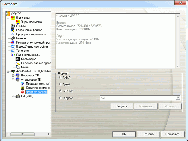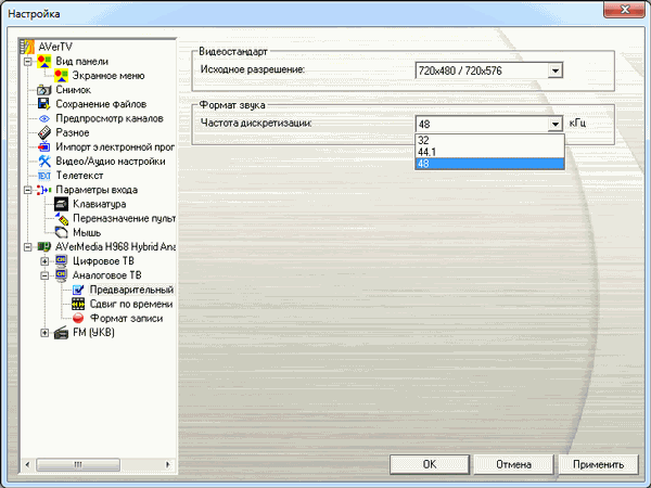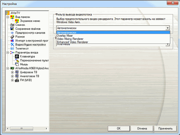 Раздел видео и аудионастроек содержит два пункта — выбор видеорендерера (автоматически, Overlay Mixer, Video Mixing Renderer и Enhanced Video Renderer при доступности последнего в системе) и MPEG2-декодера (собственный декодер от AVerMedia или Microsoft DTV-DVD Video Decoder).