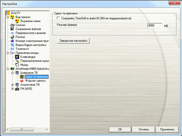 Режим отложенного просмотра TimeShift, в локализации от AVerMedia называющийся сдвигом по времени, поддерживает сохранение буферного файла в пределах заданного объёма (только для MPEG2, поддержки H.264 нет).