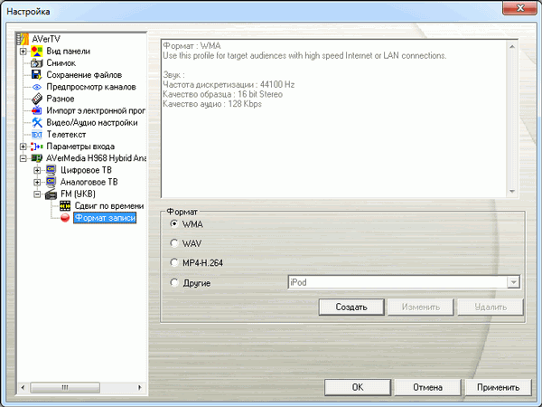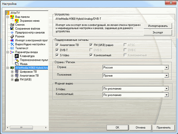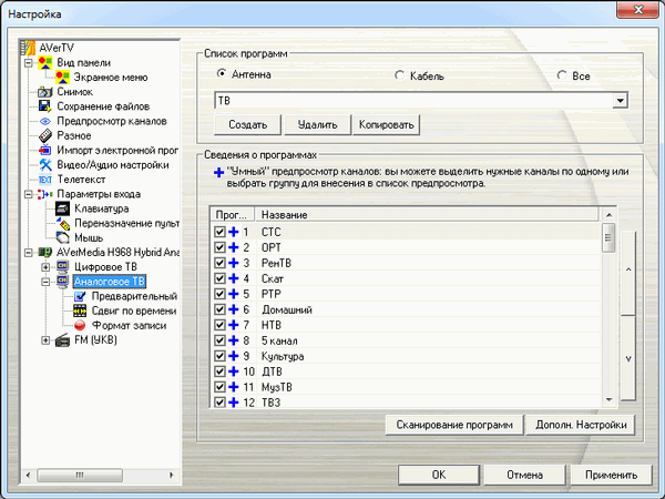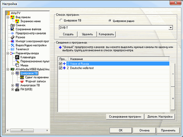 Несмотря на возможность DVB-T передавать на одной частоте как телевизионные каналы, так и радиостанции, подход AVerMedia предусматривает раздельное отображение теле- и радиоканалов как для аналогового, так и для цифрового режимов. При выборе России в качестве региона автопоиск работает корректно. Можно сохранить несколько пользовательских профилей.
