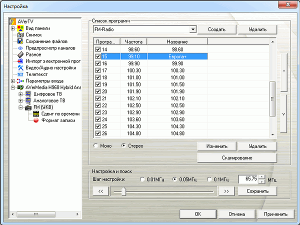 Программа использует общий интерфейс для всех режимов. В AVerTV 6.3 предусмотрены готовые списки радиостанций Москвы и Санкт-Петербурга, кроме того, цифровая панель имеет два режима работы — переключение каналов и ввод частоты.
