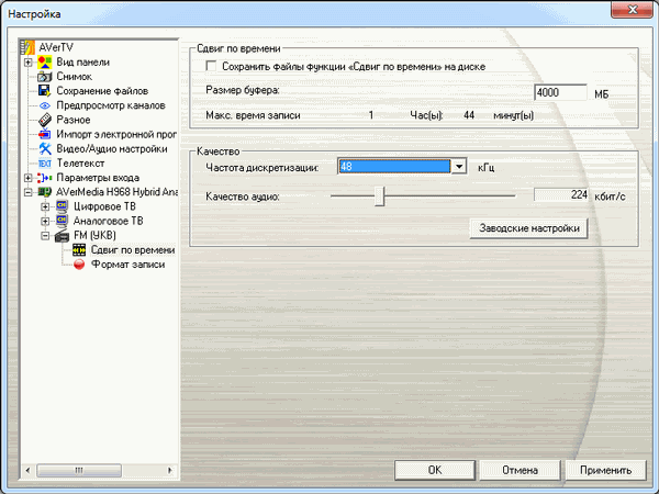 FM-режим имеет свои настройки режима сдвига по времени (используется MPEG2). В одноименном разделе можно выставить битрейт (192—384 Кбит/с) и частоту дискретизации (32, 44,1, 48 кГц). Сохранение буферного файла доступно и здесь.